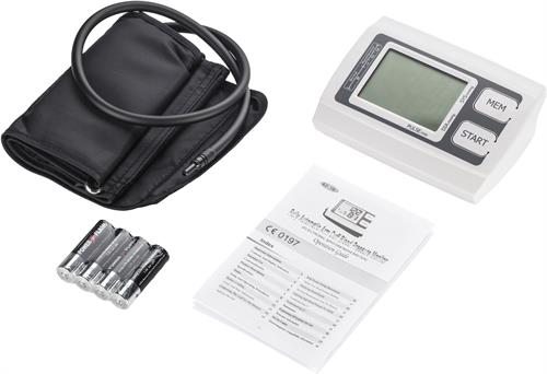 Displayen visar systoliskt och diastoliskt blodtryck, puls, tid/datum, batterinivå och oregelbunden hjärtslag. Monitorn drivs på fyra AA (LR6) batterier (medföljer).