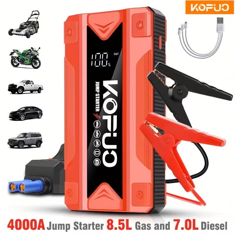 Bärbar bilbatteri-startare med 4000A kapacitet, lämplig för motorer upp till 8.5L bensin och 7.0L diesel. Denna 12V startbox har USB-portar, en powerbank, dubbla utgångar, ett LED-ljus och en billaddare.