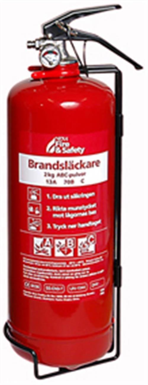 Brandsläckare med 2 kg ABC-pulver för lägenheter, villor och fritidshus. Väggfäste medföljer.